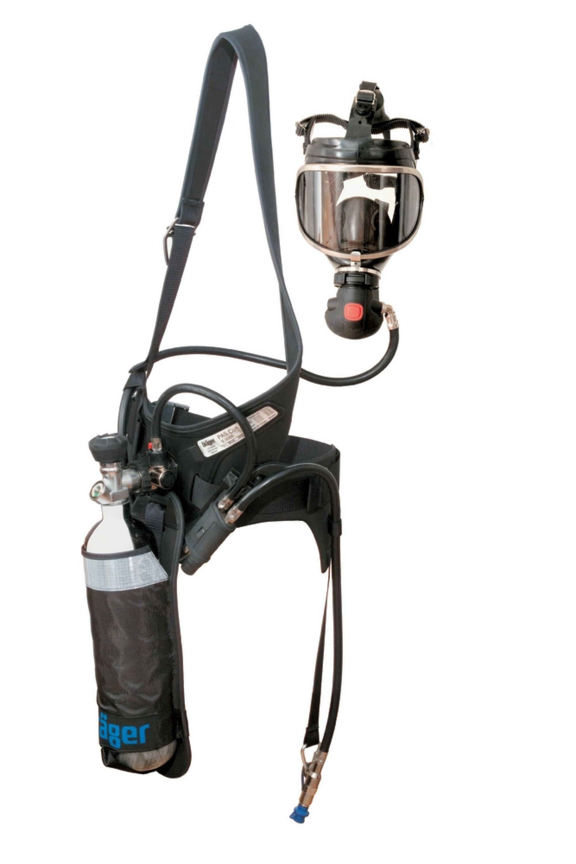 Das Gerätegewicht liegt unter 5 kg bei der Verwendung mit der 2L/300 bar CFK-Flasche, dem integrierten A-Lungenautomaten und der Nutzung einer Dräger Panorama Nova Atemschutzmaske.